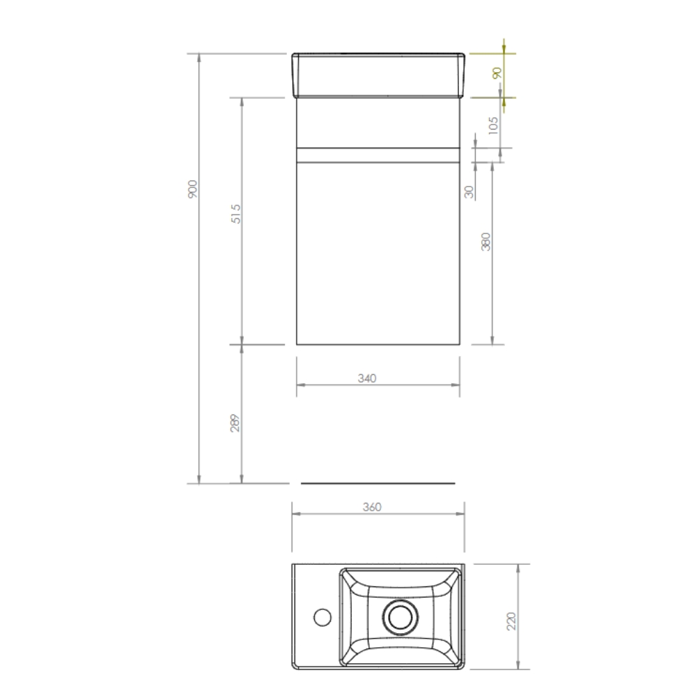 Atop the unit sits a sleek rectangular ceramic basin 90mm tall. Its versatile design allows the basin to be positioned on either the left or right side, with its single tap hole positioned oppositely, providing flexibility in mono-basin tap placement to suit your specific layout needs.