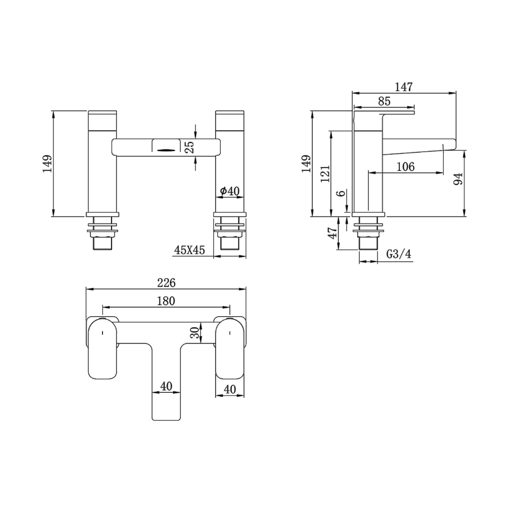 Measuring 226mm in width and 149mm in height, the rectangular frame of this bath mixer tap is adorned by two similarly shaped lever handles, which are turned outward to adjust the hot and cold water levels from its slim spout.
