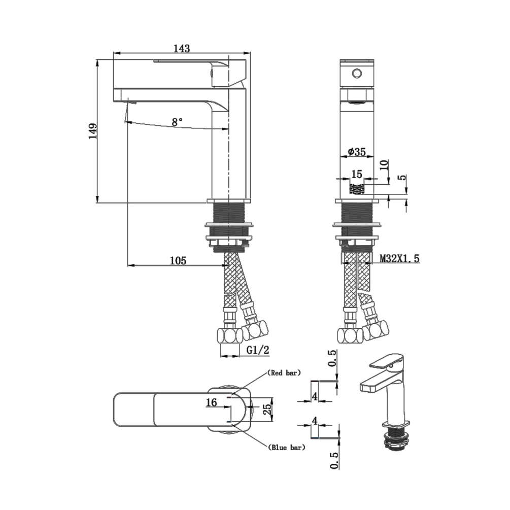 This striking basin mixer tap is the result of two contrasting yet harmonious shapes blending seamlessly into a small but powerful tap. The body of the tap is a robust round design, measuring 35mm in diameter and 149mm in height, and serves as the foundation for the sleek rectangular lever handle. The lever flows effortlessly into the fixed spout below, which extends 143mm from the body, offering optimal clearance for comfortable and unrestricted handwashing in a cloakroom basin.