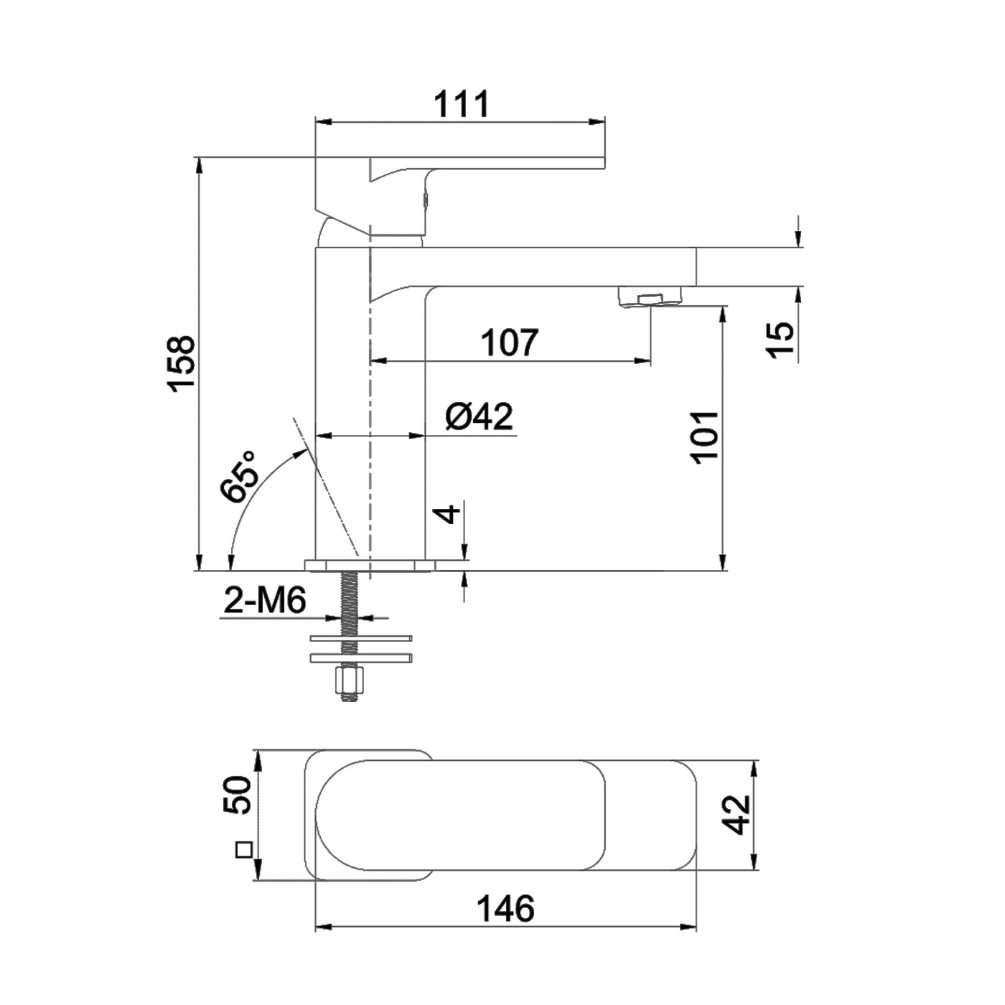 Two distinct shapes come together to form this elegantly crafted basin mixer tap. The round tap body, measuring 42mm in diameter and 158mm in height, is topped with a rectangular slimline lever handle featuring smooth, curved edges. The lever’s design continues seamlessly into the fixed spout below, which extends 146mm from the tap body. This distance provides ample space for comfortable handwashing without feeling cramped or confined.
