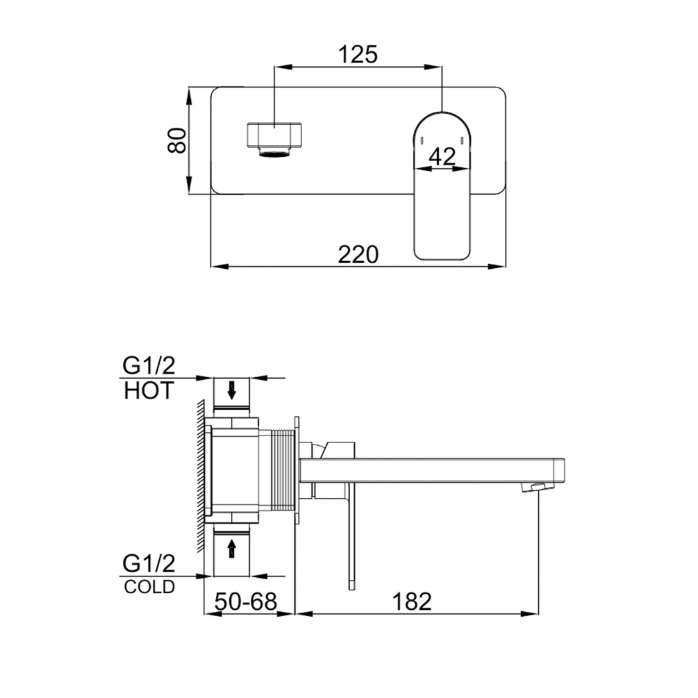 This wall mounted basin mixer features a backplate that measures 220mm in width and 80mm in height. The lever handle and spout share a cohesive rounded rectangular design, adding a minimalist and contemporary charm that complements a variety of bathroom styles.