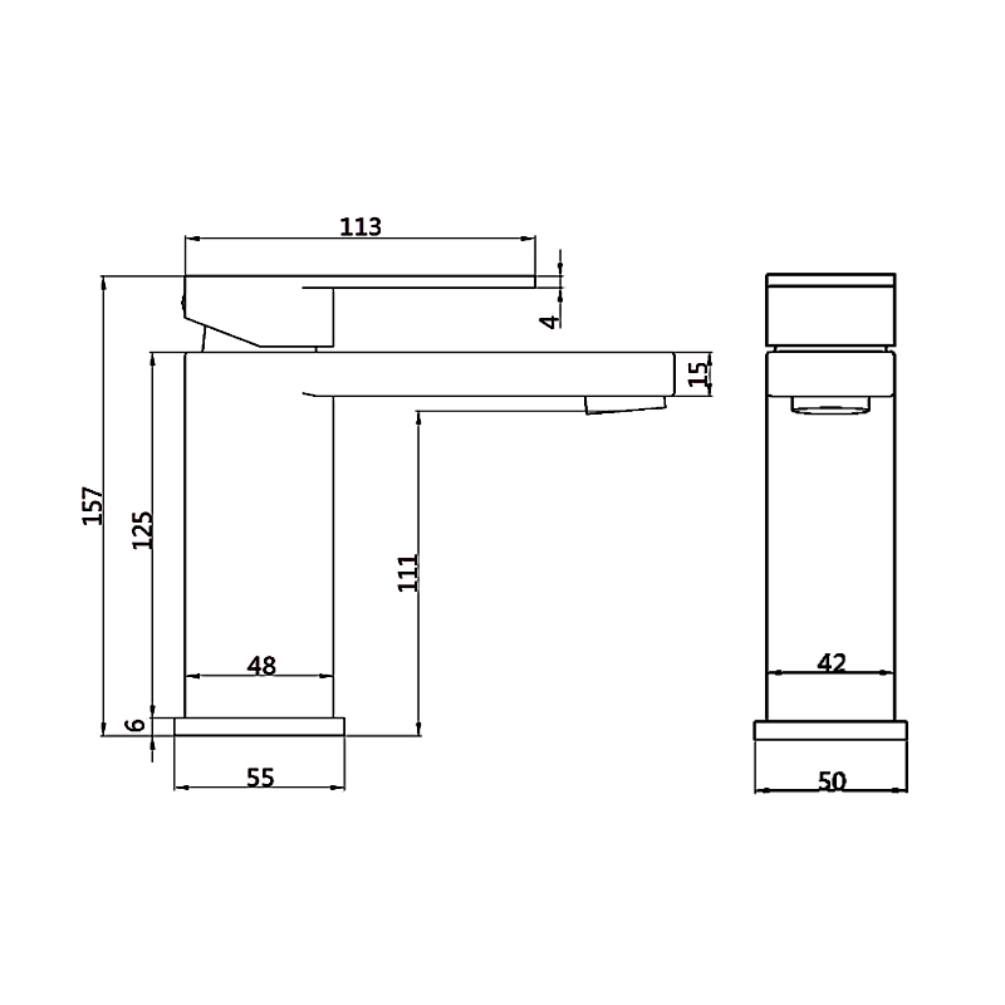 The cubic tap body of this mono basin mixer, which measures 42mm in width and 157mm in height, is softened by its rounded edges to produce its uniformly sculpted frame. This motif continues into the shaping of its rectangular spout, which similarly employs curvaceous edges and corners to blend its smooth sides while maintaining its geometric appearance.