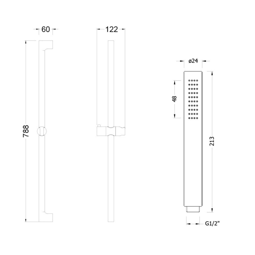 This shower kit includes three main components. Firstly, it comes with a 790mm high shower slider rail featuring a robust, intuitive bracket designed to hold and adjust the handheld shower's height securely. Secondly, a round, microphone-style handset shower showcases an ergonomic design and delivers excellent water distribution for a refreshing shower experience. Lastly, it provides a flexible PVC shower hose that is easy to handle and is available in two sizes to suit your space requirements.