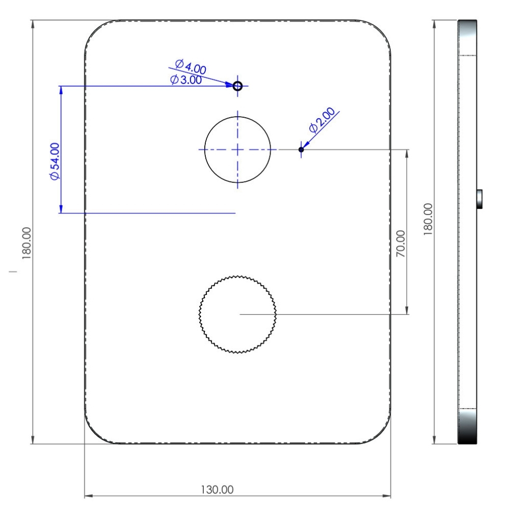 This thermostatic shower valve features a rounded rectangular backplate that measures 130mm wide by 180mm high. It is equipped with two cylindrical dials, each having a small, protruding handle for easy use, even with wet hands.