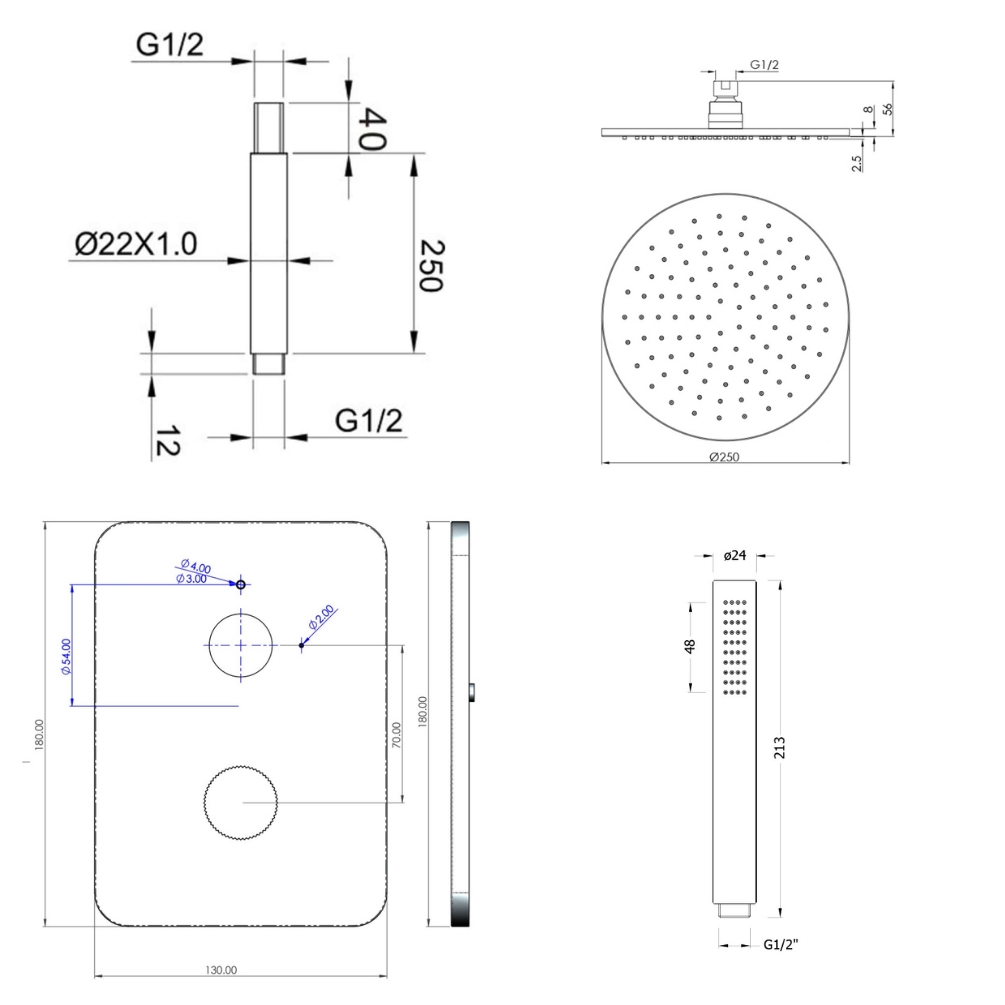Measuring 130mm in width and 180mm in height, this thermostatic shower system is operated via its dual outlet shower valve, which consists of two cylindrical dials mounted on a rounded rectangular backplate. Small handles feature on the edge of either dial, demonstrating their starting positions while improving the grip of slippery fingertips.