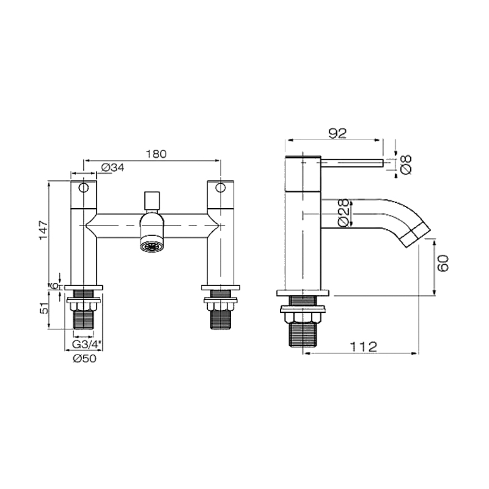 Measuring 180mm in width and 147mm in height, the rectangular frame of this bath shower mixer tap features two cylindrical lever handles in it upper corners, which can be turned outwards to adjust your hot and cold water levels. Extending from the middle of the tap body is its similarly cylindrical spout, which bends downwards at its open end such that it directs your bath water cleanly into the bathtub below.
