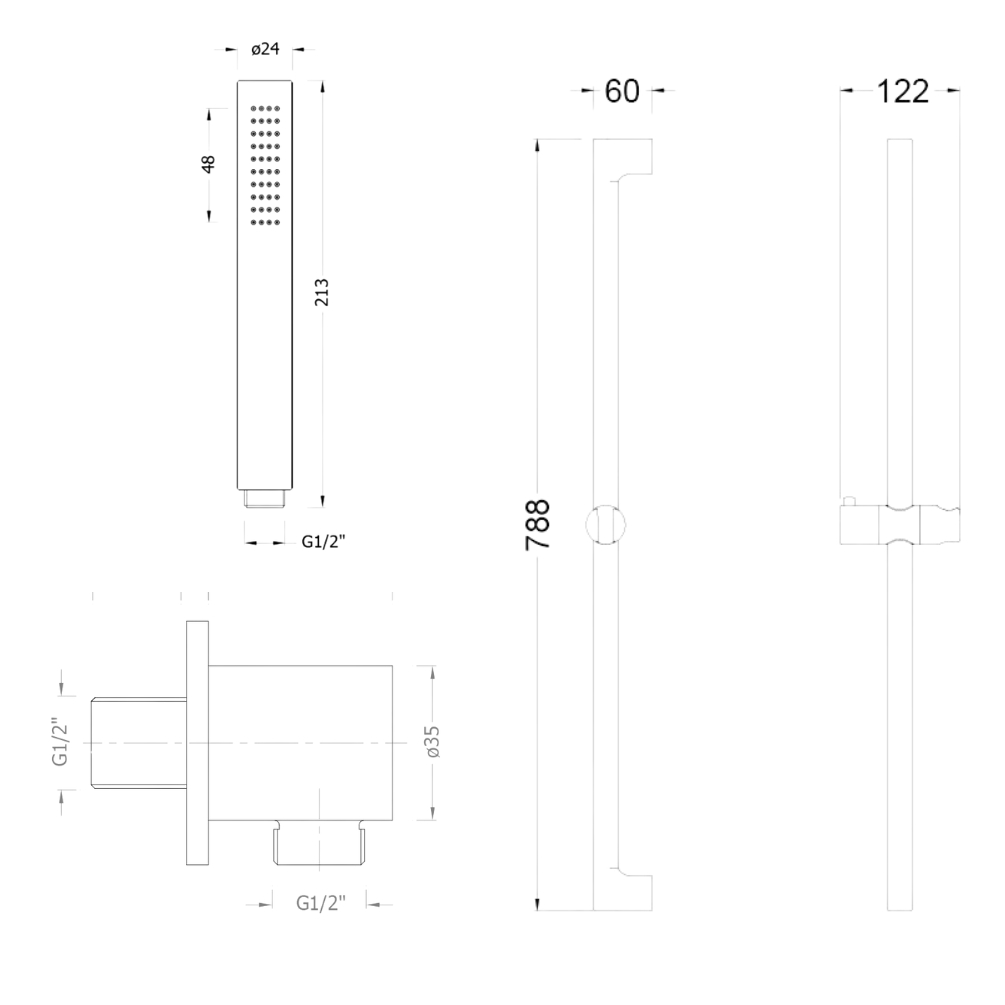 This riser rail kit features a 790mm high rail with a bracket, along with a handheld shower that has a pencil-style design. The shower measures 24mm in diameter and is 213mm high, connected to a 1600mm long shower hose. Additionally, the kit includes a 35mm diameter round shower outlet, which allows for a direct connection to your water supply through the bathroom wall.