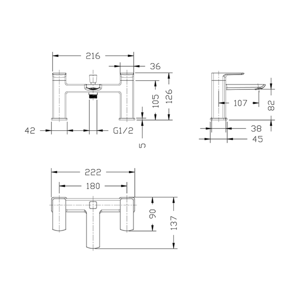 Measuring 222mm in width and 126mm in height, the rectangular frame of this bath shower mixer consists of a slim bar connecting two pillars, each with convex front facing surfaces in contrast to their flat sides and backs. This subtle curvature is apparent across its design, stretching embellishing the front of the connecting bar as well as the underside of the central spout, tapering off at its open end to form a fine point that accentuates its slimline design.