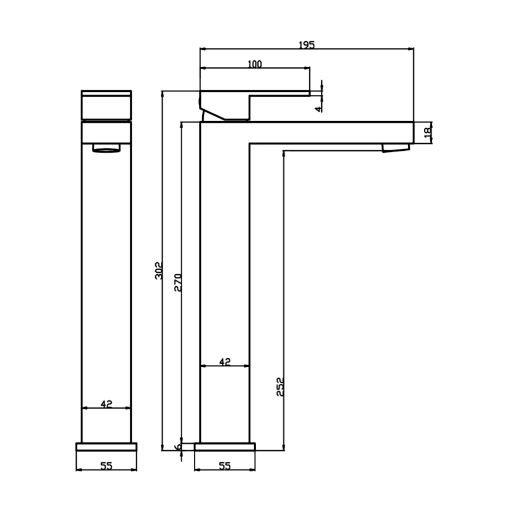 Measuring 42mm in width and 302mm in height, the square tap body of this tall basin mixer comprises of straight sides and precision point edges, its clean geometry accentuating the confident simplicity of the fixture.