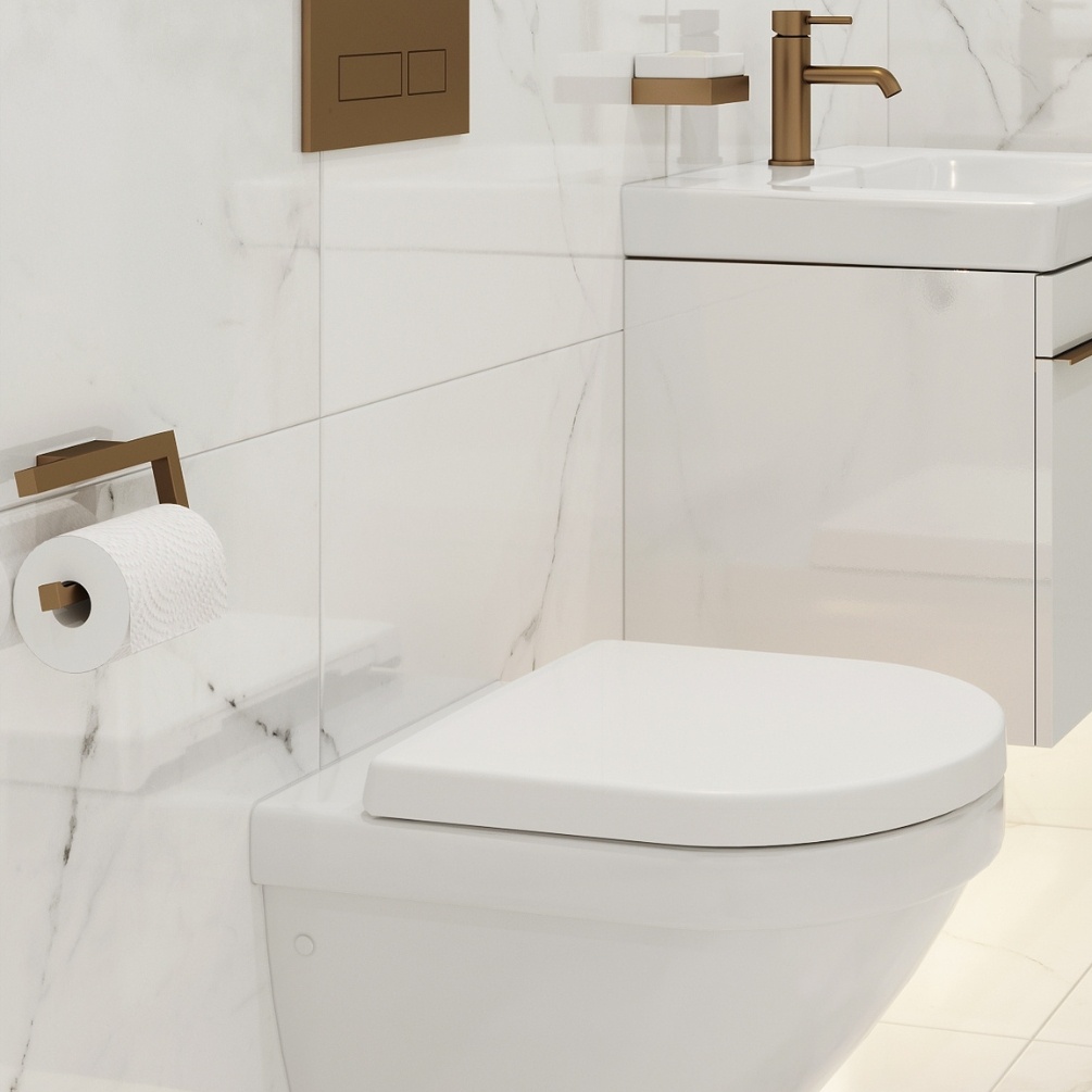 This rectangular toilet roll holder, which measures 153mm in width and 80mm in depth, features a subtle lip at its open end to ensure your fresh rolls are secure upon its smooth brushed bronze arm, without compromising the ease with which you can remove rolls once they are depleted.