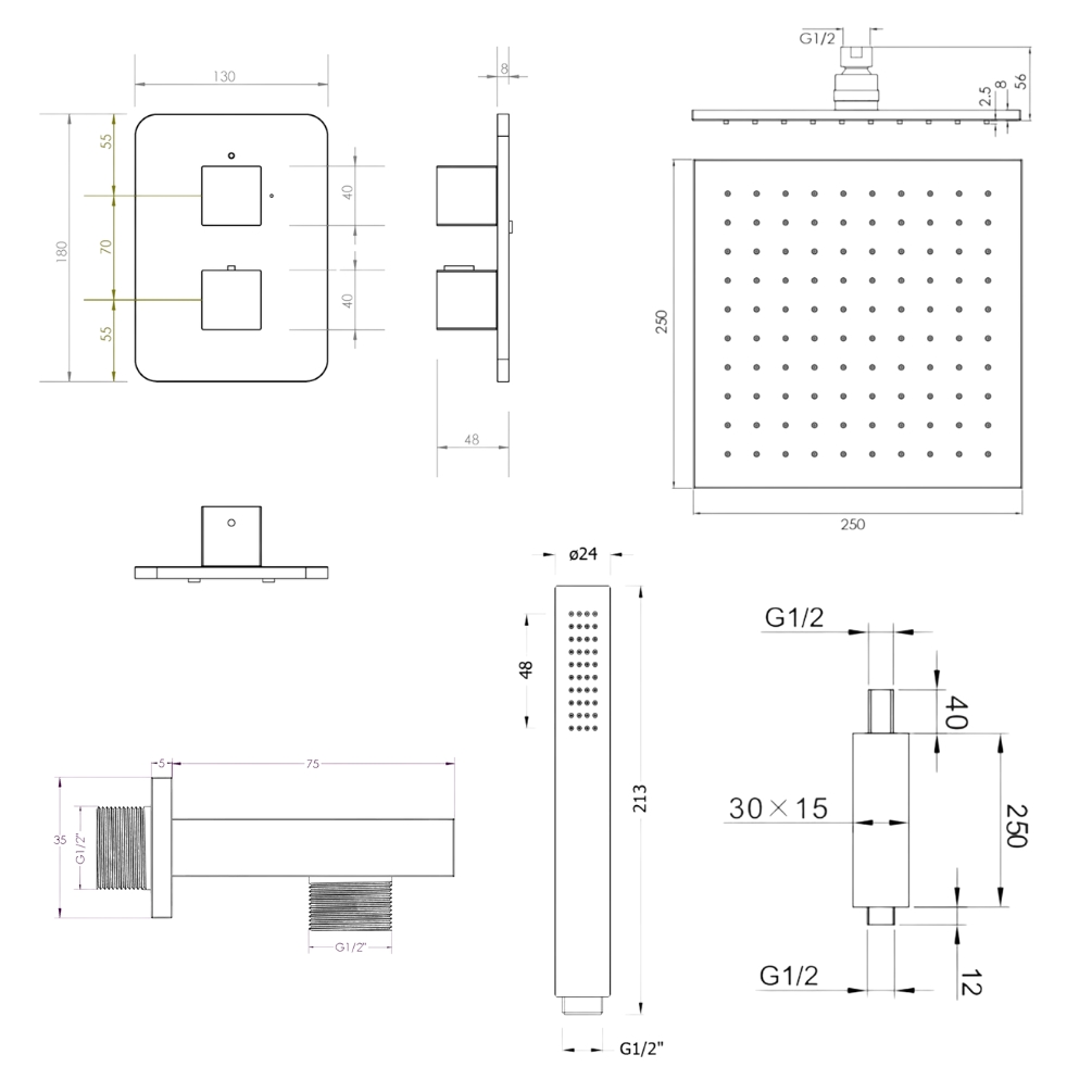 The Square Brushed Brass 2 Outlet Shower Pack with Ceiling Head & Handset is a vital part of the Abacus range, providing key components for creating your dream luxury concealed shower enclosure with advanced thermostatic features.