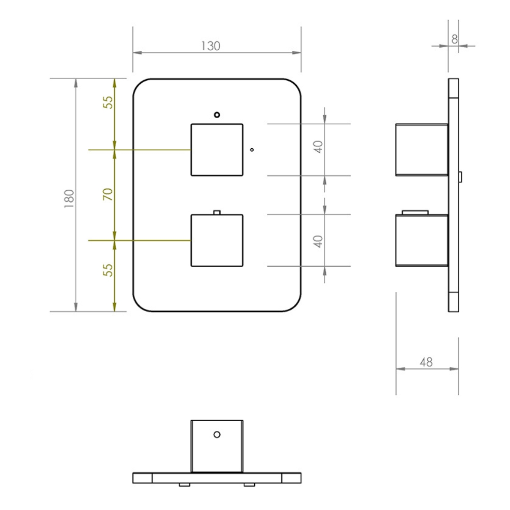 At the heart of its design are two square-shaped dials, bold yet user-friendly, that deliver precise and effortless control. The ergonomic design of the dials makes it easy to switch between outlets while also allowing fine adjustments to water temperature. These controls are mounted on a rectangular backplate, measuring 130mm in width and 180mm in height, with gently rounded edges that lend a softened, minimalist aesthetic to the overall look.