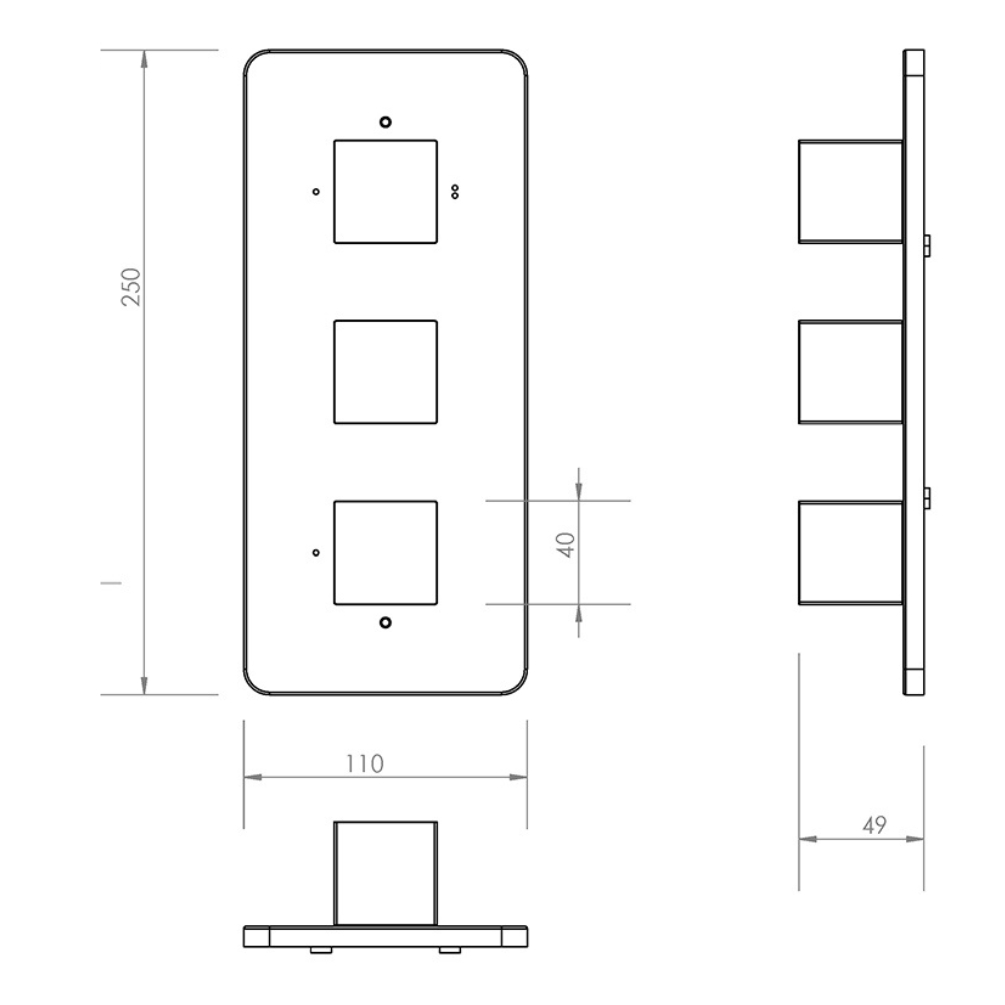 At its core, this triple outlet valve features three ergonomically designed, square-shaped dials that are large, chunky and satisfying to use. These dials allow for effortless transitions between outlets and enable precise temperature adjustments. The controls are set against a sleek rectangular backplate, measuring 110mm wide by 250mm high, which seamlessly integrates into the overall design of the valve. The dials and backplate of this fixture are beautifully crafted with a sleek brushed brass finish, making it an ideal component for a thermostatic shower mixer in an elegant bathroom design.