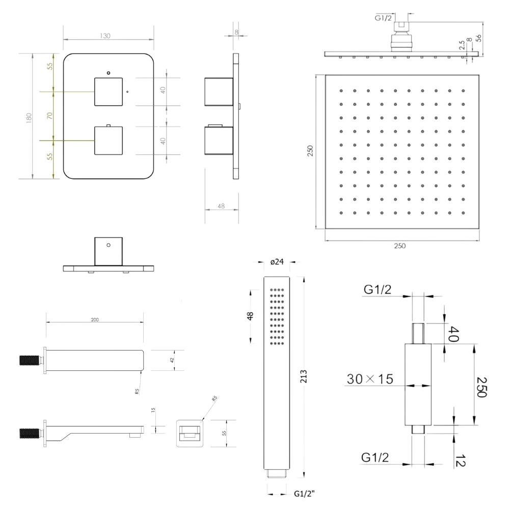 First, there’s the wall mounted shower head, which features a square design and measures 250mm in width and depth. It is equipped with limescale-preventing, rubber-tipped nozzles. Complementing it is a 380mm deep square shower arm, which securely mounts the shower head to the wall of your enclosure. Next is the elegant pencil handset shower extension, connected to a wall bracket via a 1200mm long hose, providing ample reach for various tasks. When it’s time for a soak, a bath spout with a reach of 200mm from its wall bracket is also included. This spout has a rectangular profile with curved edges, giving it an ultra-modern appearance that enhances the streamlined look of the shower system.