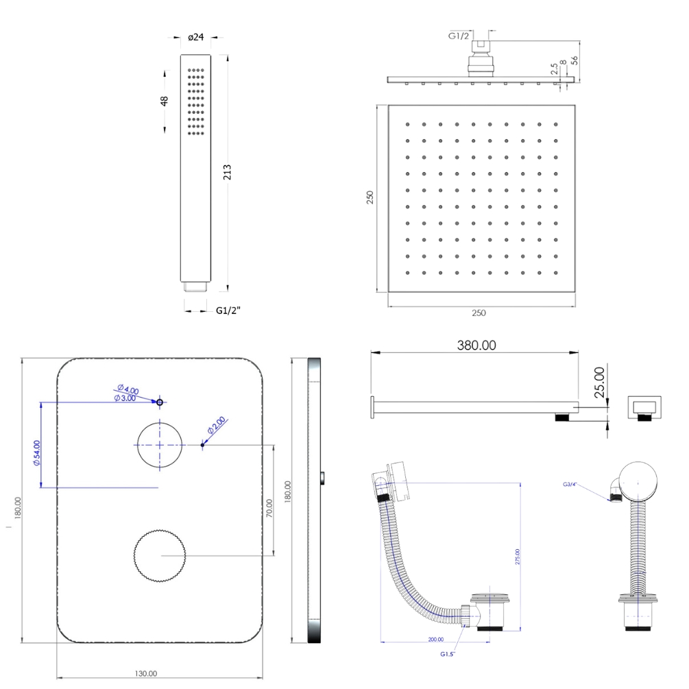 Measuring 250mm in its width and height, the square face of the wall mounted shower head is covered in many rubberised nozzles that can be wiped with your hand to remove and reduce the build-up of limescale over time. The shower head is attached to the wall of your enclosure via a matching square shower arm, which measures 380mm in its depth.