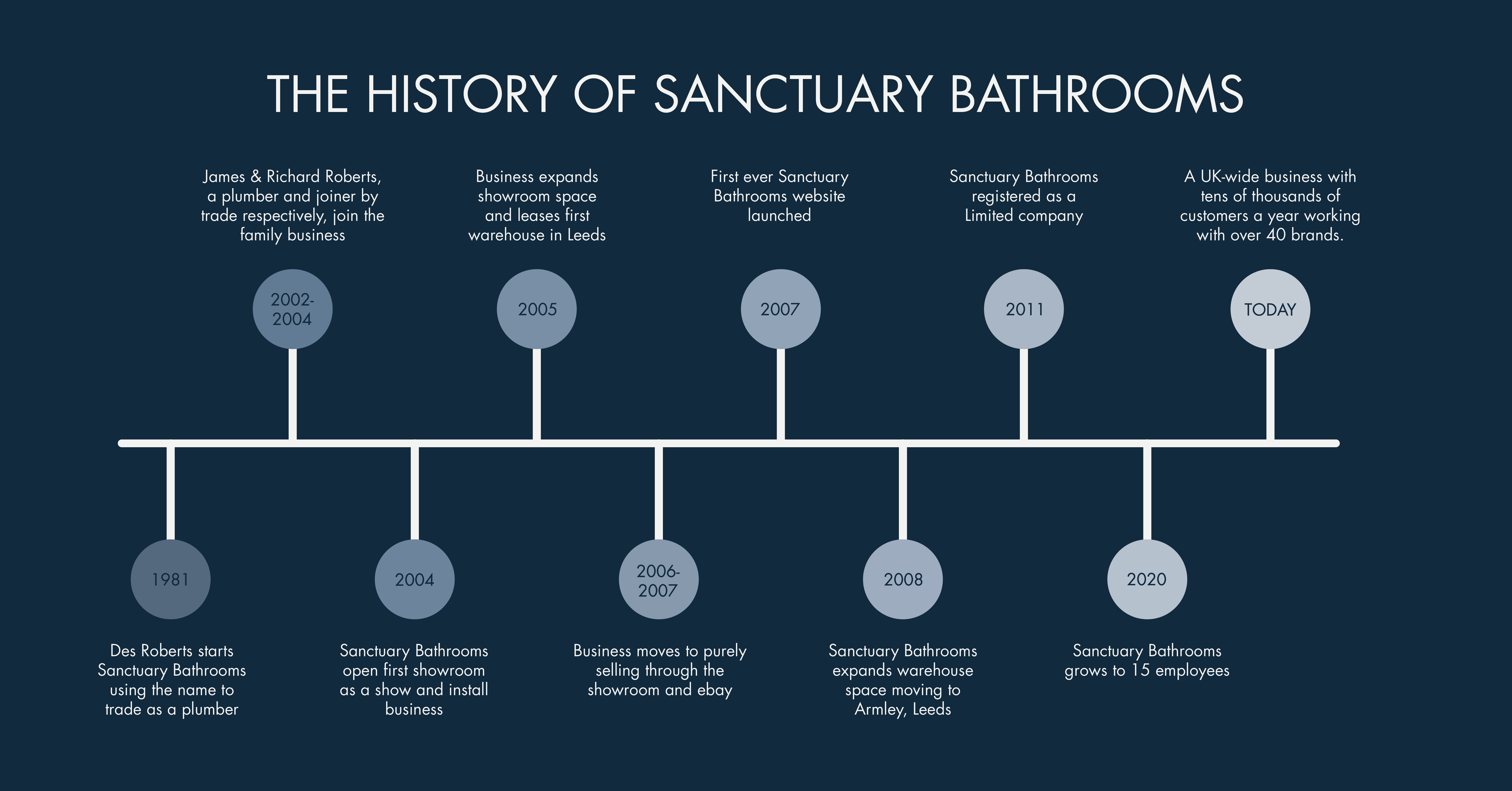 The business’s roots start back in the early eighties. A self-employed plumber, Des Roberts, started trading as Sanctuary Bathrooms in Yorkshire. His sons, Richard and James, also both qualified tradespeople, joined the business at the turn of the millennium and together they have built Sanctuary Bathrooms to a competitive brand, and trusted name in the industry, alongside their partners Sharon, Kerrie and Sarah who are all part of the business.
