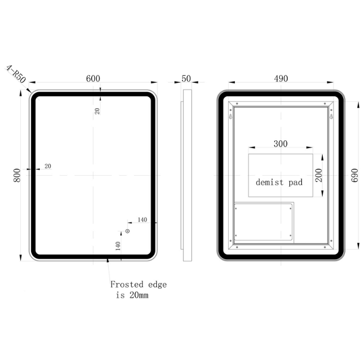 Measuring 600mm in width in 800mm in height, the edges of this rectangular mirror are lined with a 30mm strip of colour changing LED lights, which are operated via the touch sensor switch located on the bottom right corner of the mirror face. Tapping the sensor will bring the lights to life, while simultaneously activating the heated demister pad to ensure the mirror remains free from steam whenever it is in use.