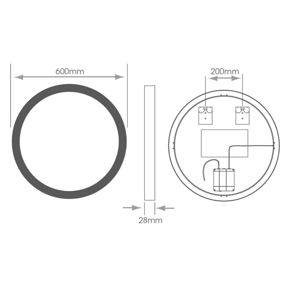 Measuring 600mm in diameter, the round face of this illuminated bathroom mirror is framed by a circle of colour changing LED lights, which are operated via the two touch sensor buttons inlaid at the bottom of the mirror face.