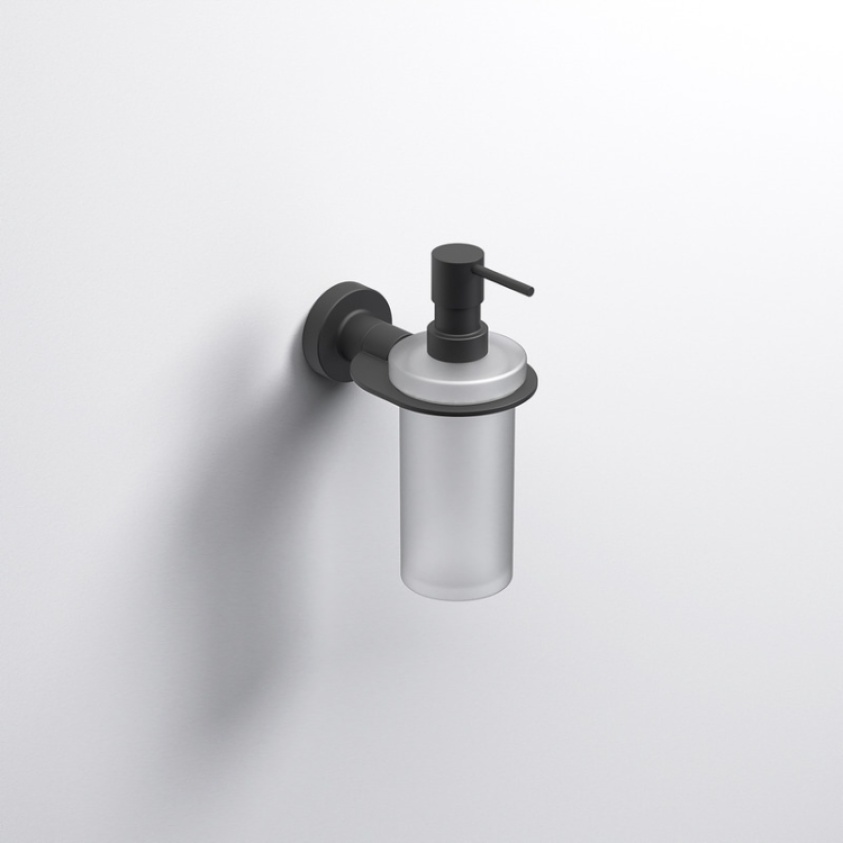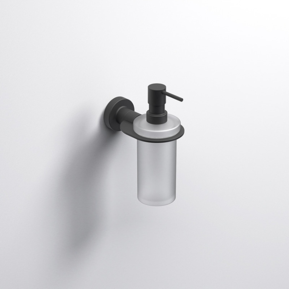 The frosted glass insert of this wall mounted soap dispenser, which measures 79mm in width and 142mm in height, can be easily removed from its matt black holder whenever it needs refilling, eliminating the need to attempt any awkward angles while it is still attached to your bathroom wall.