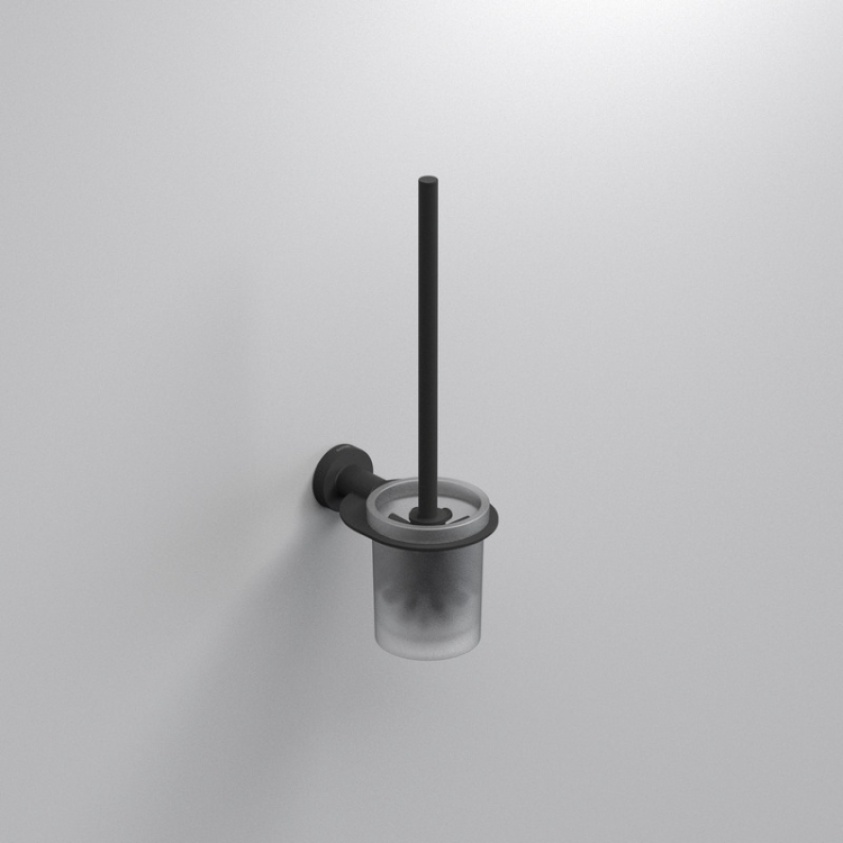 The cylindrical handle and circular wall bracket of this toilet brush set, which measure 103mm in width and 378mm in height, are covered in striking matt black, with the intention of lending your space some contemporary glamour while complementing any of your fixtures already sporting the same finish. The frosted glass holder should be similarly impactful, plus it can be lifted out such that it can be washed as you would any other piece of glassware.
