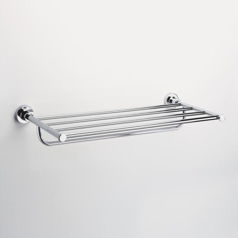 Identical cylindrical bars frame the rectangular design of this striking towel rack, which projects 248mm to provide ample room for multiple folded towels to be neatly tucked away. In addition to the four bars running across the top of the product, there is a final bar hanging 100mm below the rack such that a damp towel can be hung to dry.
