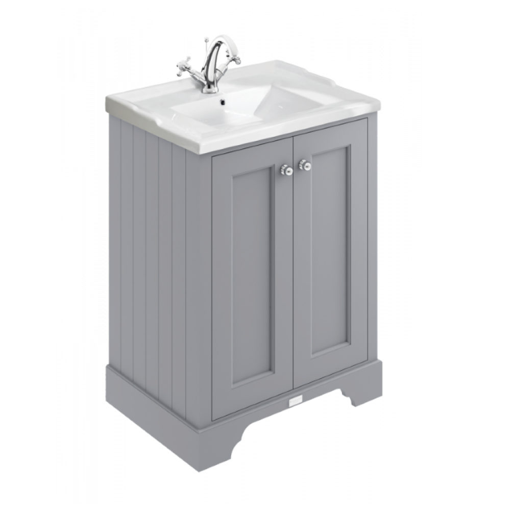 This practical floorstanding vanity unit features two soft closing doors, in a unique Plummett Grey finish, with a choice of one to three tap hole basin that will make a statement in any traditional bathroom.