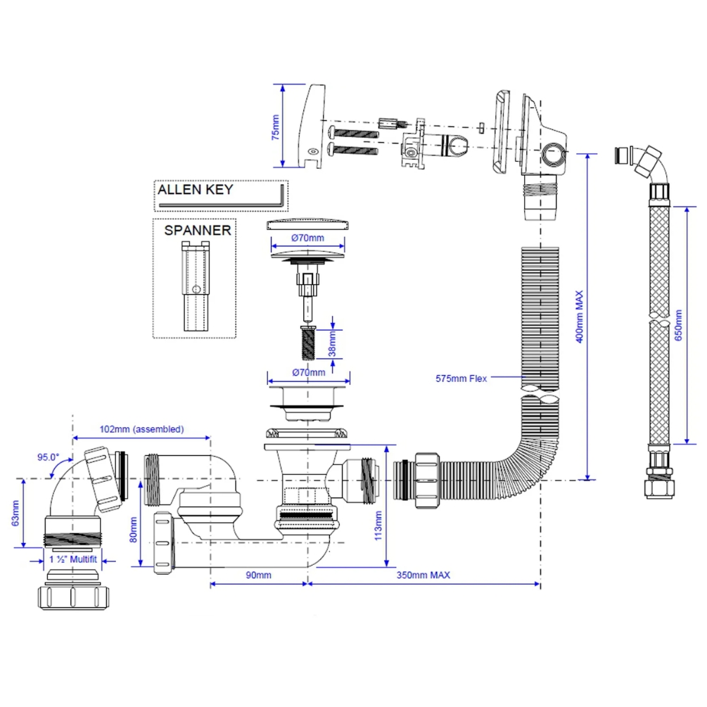 The attached trap prevents debris such as hair or dirt from clogging the pipes below, while the overflow pipe helps prevent flooding by allowing excess water to flow through it in the event of overfilling the bath.