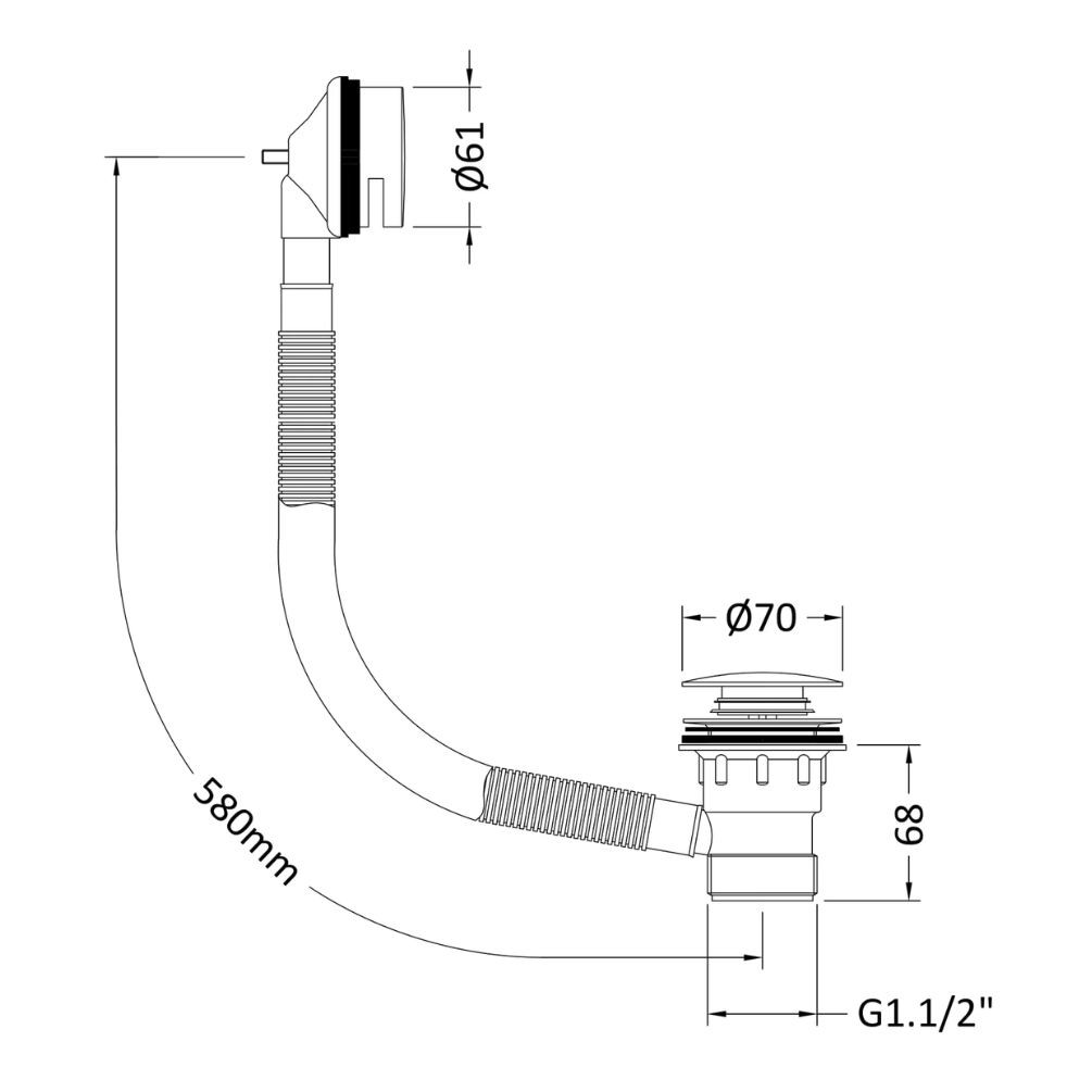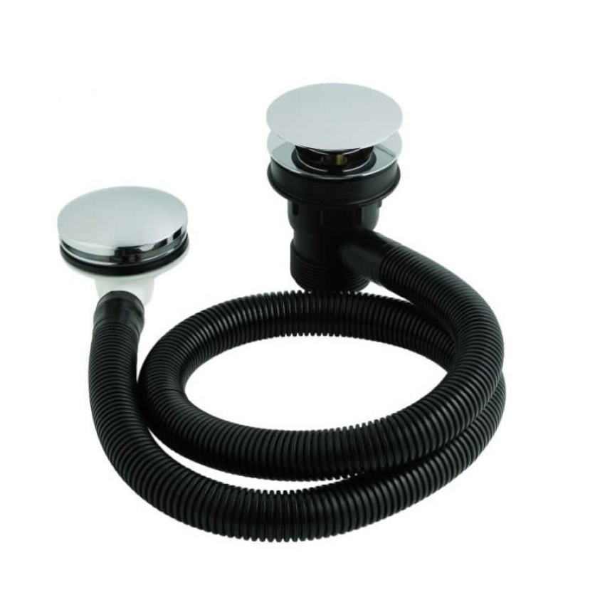 At one end is the round overflow made of stainless steel, and finished in polished chrome. It is positioned in the bath’s overflow and connected to the flexible black connector pipe, which snakes down to the click-clack bath waste. This sits in your bath’s plughole, and its slotted design allows excess water to flow down the pipe from the overflow, if the bath is overfilled by mistake, directing it safely into the pipework below and preventing flooding in your bathroom.