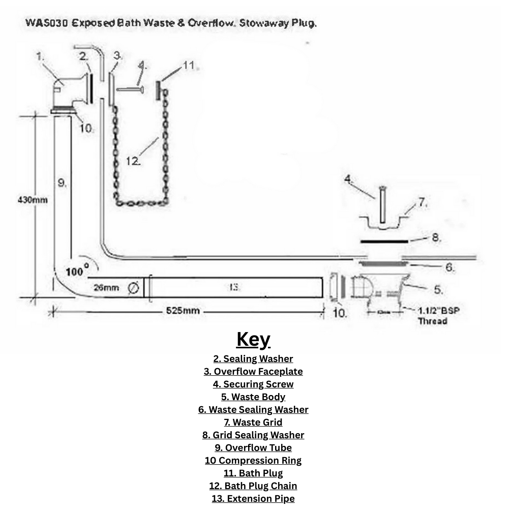 The curved pipe connects to your bath’s overflow and bends at a 100° angle to join the bath’s waste with the straight pipe.