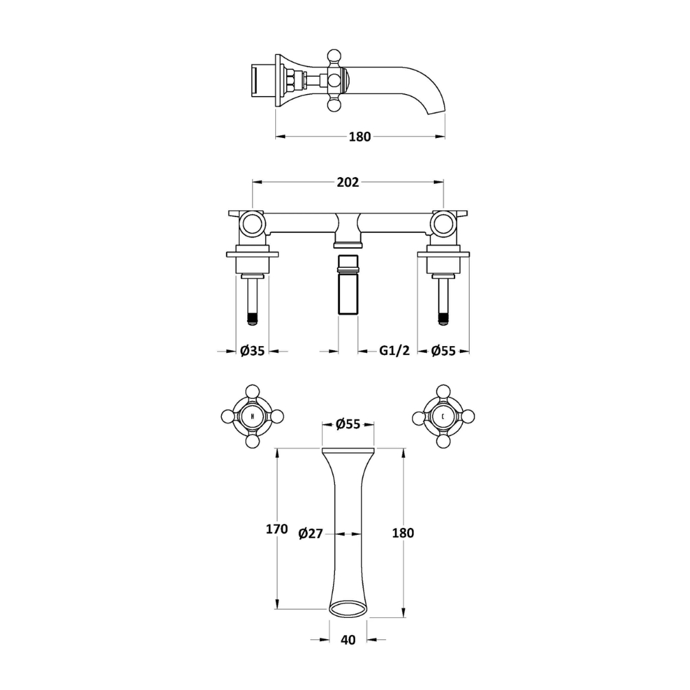 Crafted from durable brass and designed to operate at a low water pressure of just 0.1 bar, these wall-mounted basin taps require three drilled tap holes for installation.