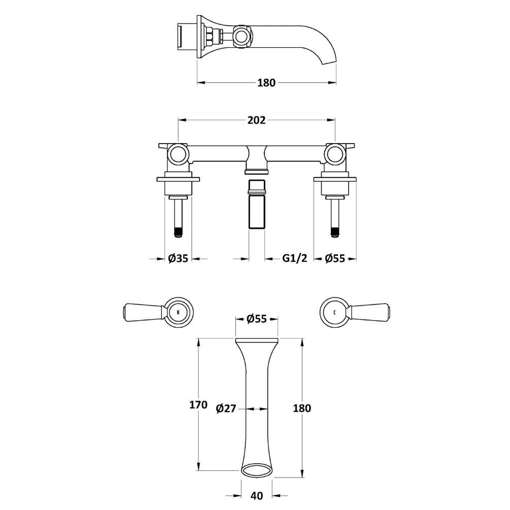 Mounted on the wall above your basin, turn the beautifully crafted cylindrical lever handles, complete with round white indices marking “hot” and “cold” to make the water cascade from the centrally fixed spout at the perfect temperature for washing your hands.