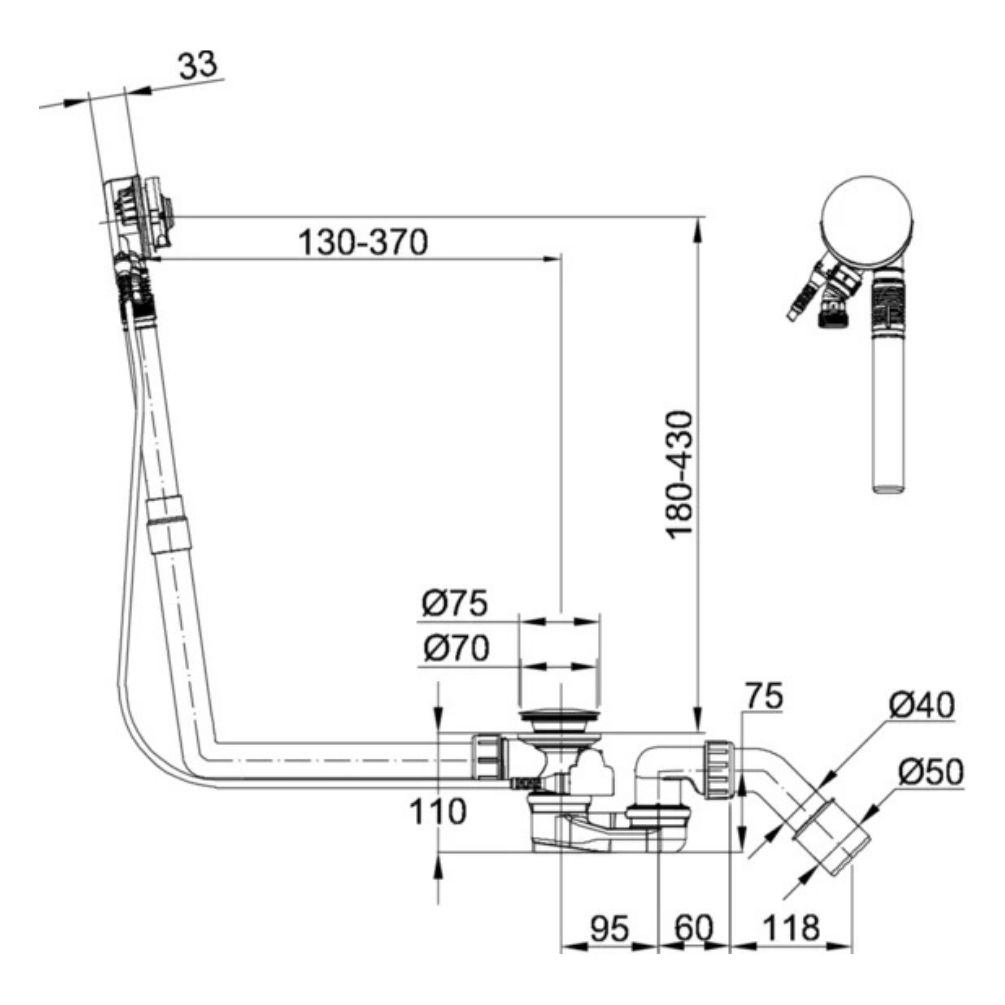 This component is designed for bathtubs equipped with a 52mm drainage hole, offering a drainage rate of 0.92 l/s and a water seal depth of 50mm.