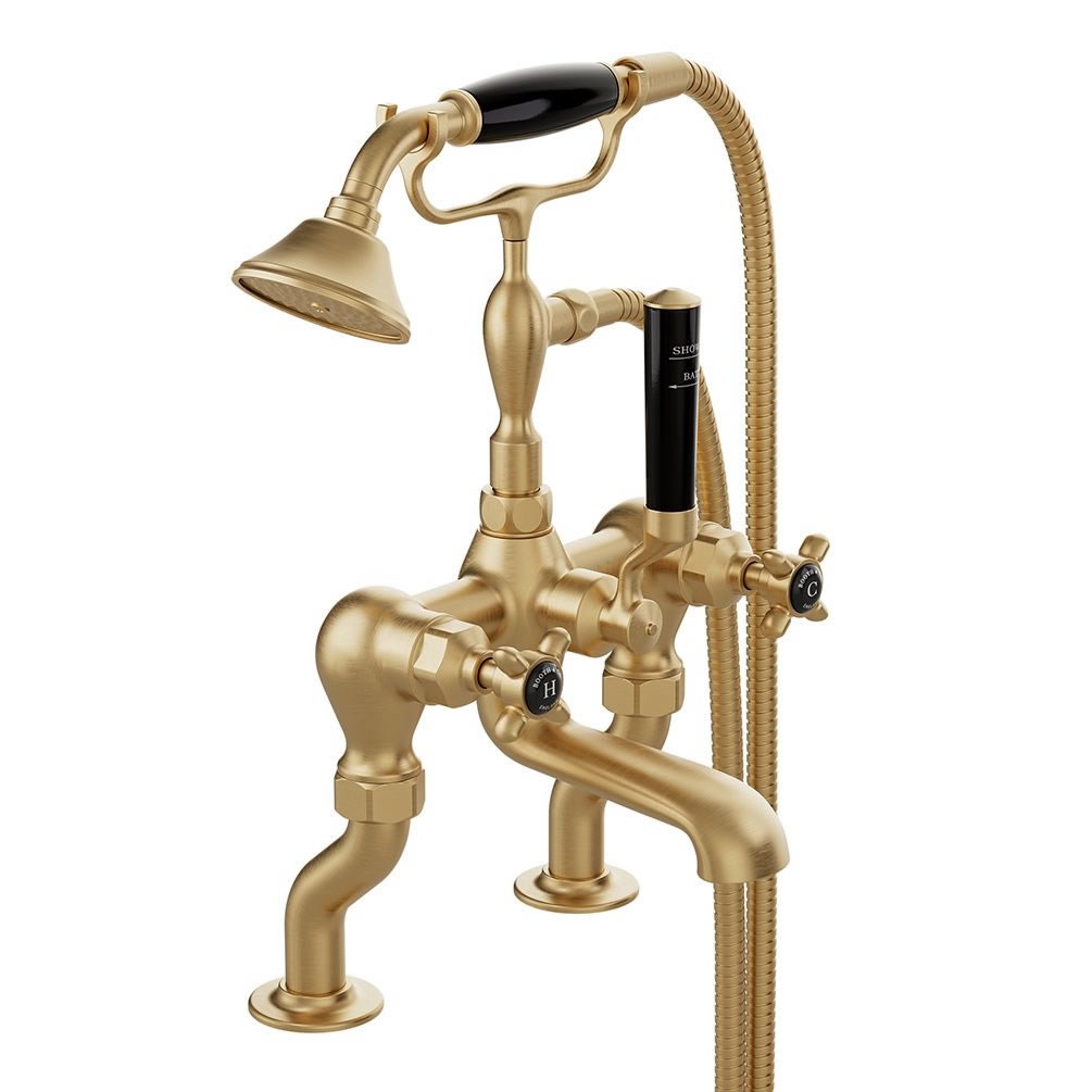 This stunning bath shower mixer combines timeless elegance and modern functionality, making it the perfect addition to any traditional styled bathroom design. Crafted from high-quality brass with a luxurious brushed brass finish, this bath shower mixer exudes a warm, sophisticated aesthetic that will instantly upgrade the look and feel of your space. The cross-shaped handles feature a striking black detail and provides effortless control, allowing you to easily adjust the water temperature and flow to your desired settings.