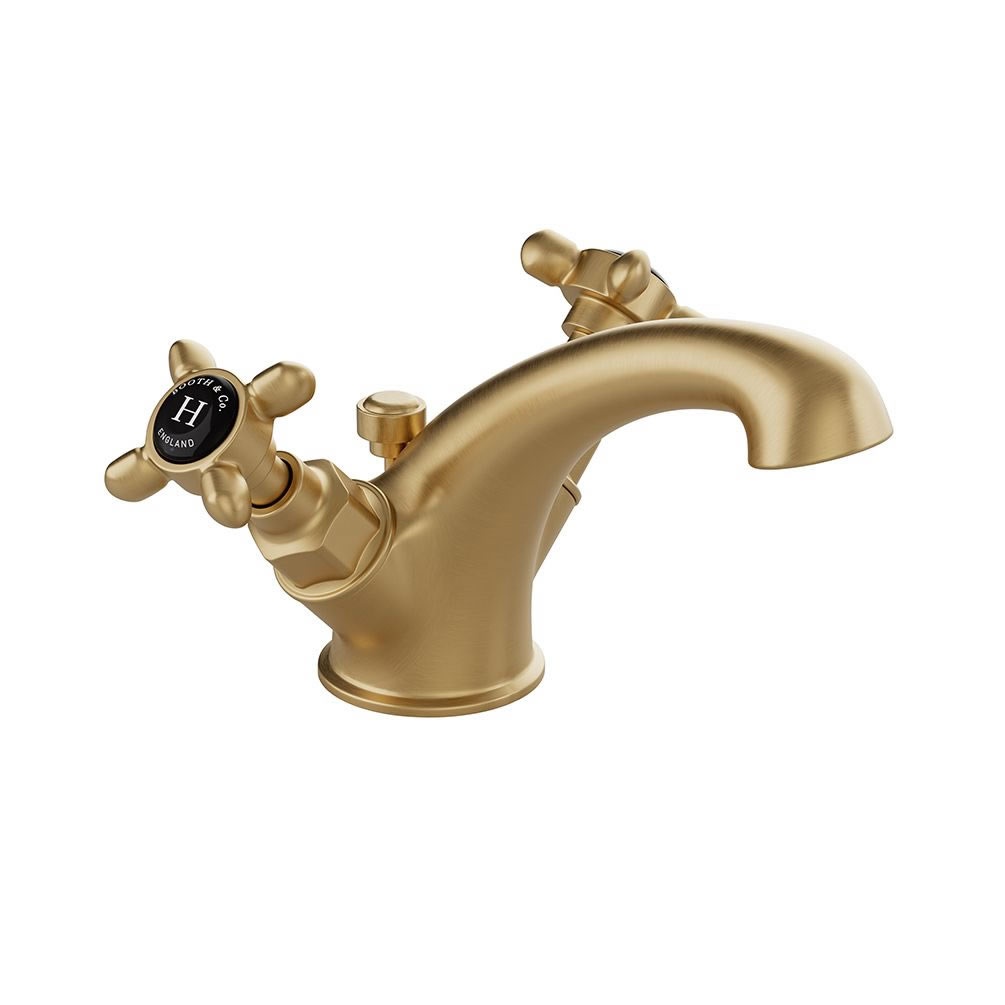 Elevate your bathroom aesthetic with the Booth & Co. Axbridge Black Cross Brushed Brass mono basin mixer.