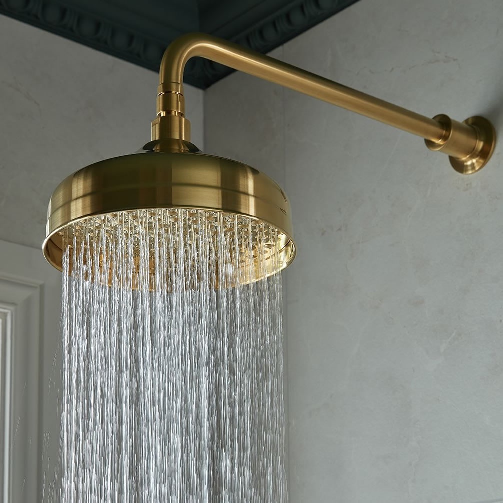 Elevate your daily shower experience with the Booth & Co. Axbridge Brushed Brass 200mm shower head & arm.