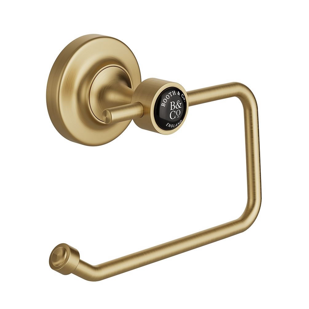 Elevate your bathroom decor with the Booth & Co. Axbridge Brushed Brass/Black toilet roll holder, the perfect blend of functionality and style.
