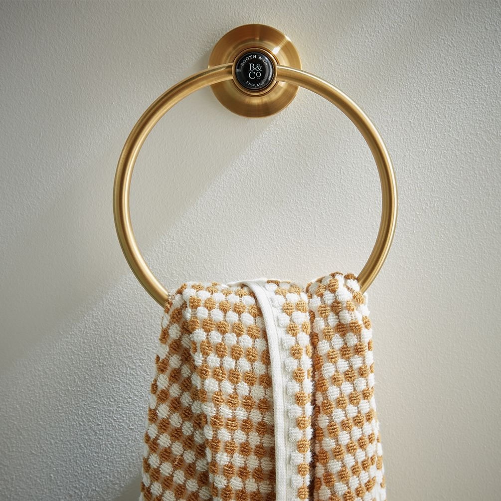 Elevate your bathroom decor with the Booth & Co. Axbridge Brushed Brass/Black towel ring, a stunning fusion of modern elegance and timeless design.