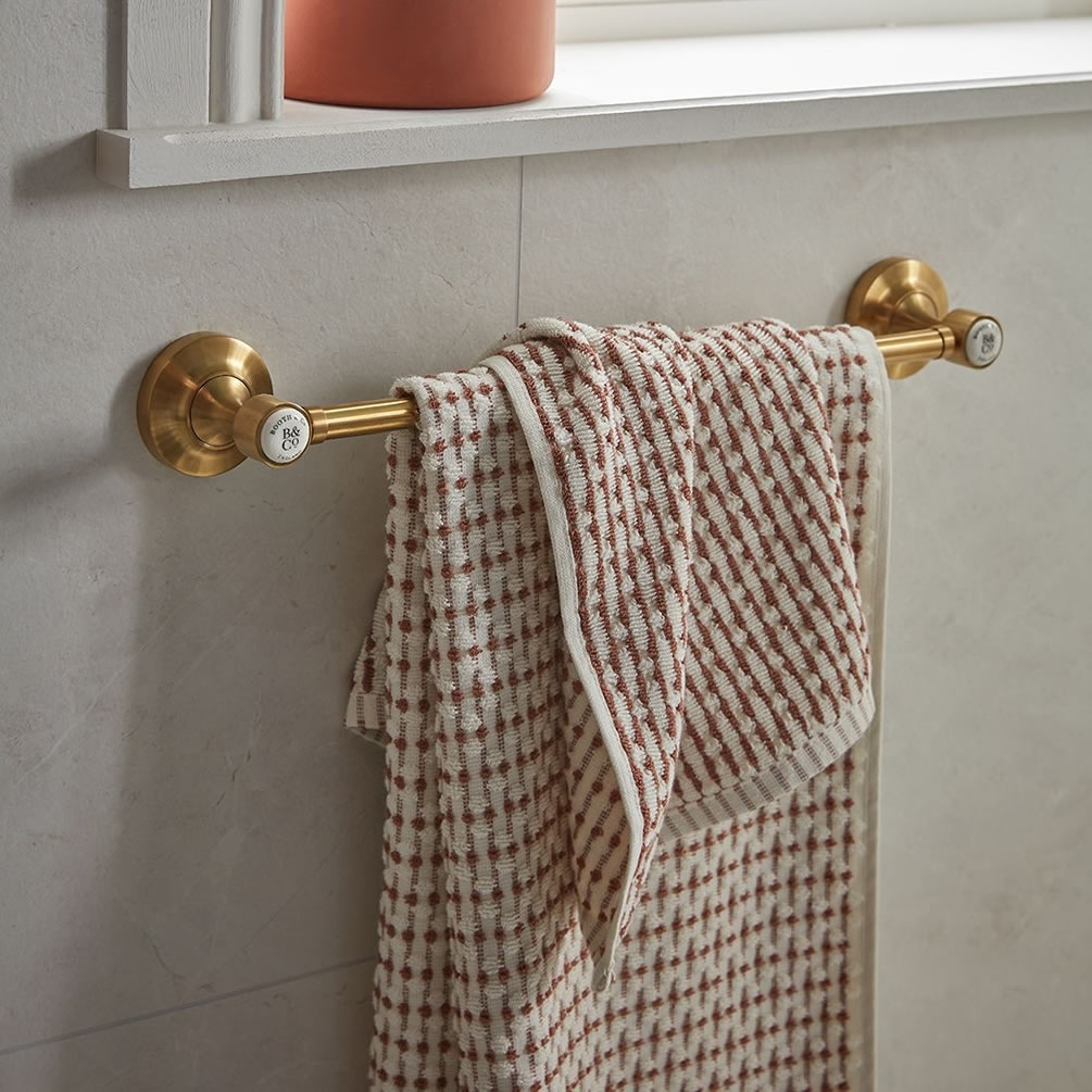 Elevate your bathroom decor with the Booth & Co. Axbridge Brushed Brass/White 450mm towel rail, a perfect blend of functionality and style.