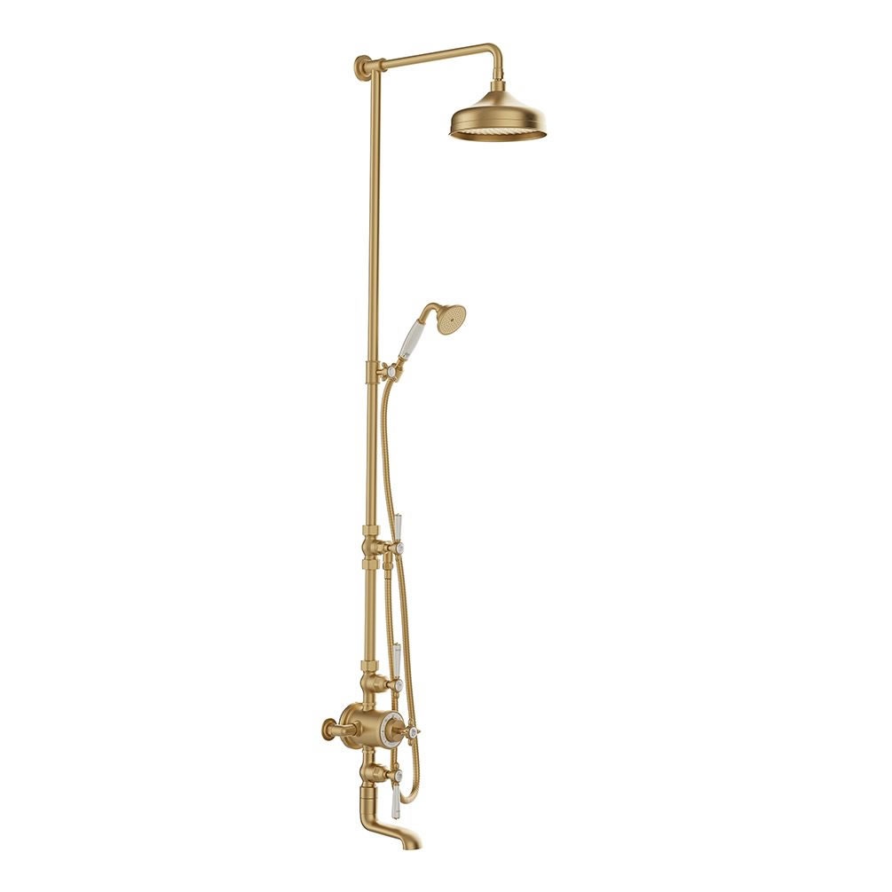 Elevate your shower experience with the Booth & Co. Axbridge Brushed Brass/White three outlet exposed shower bath column, a stunning fusion of timeless elegance and functionality.