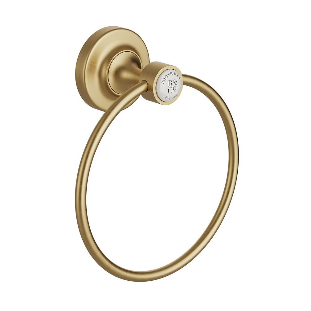 Elevate your bathroom decor with the Booth & Co. Axbridge Brushed Brass/White towel ring, a stunning fusion of elegance and functionality.