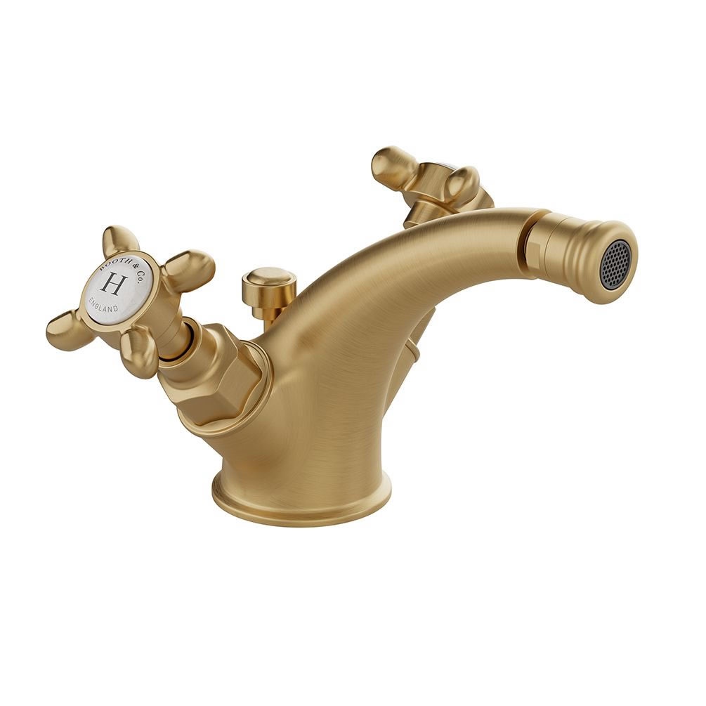 Elevate your bathroom experience with the Booth & Co. Axbridge White Cross Brushed Brass mono bidet mixer.