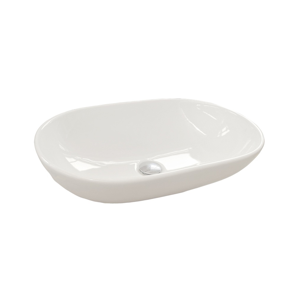 It is an elongated oval countertop basin measuring with a sizeable width of 585mm edge to edge, with its rounded shape having smooth, curved contoured edges. The piece is manufactured from fine fire clay ceramic that is finished and glazed with a gloss white colour.