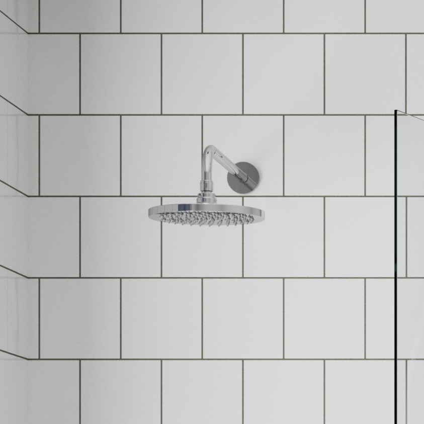 The cylindrical shower arm has a projection of 409mm from wall to the centre of the head and is fixed with a curved connection at the end for the head to be positioned directly head. The head itself is a single-function one with a 200mm diameter in size, with the entire set finished in a sparkling polished chrome finish.