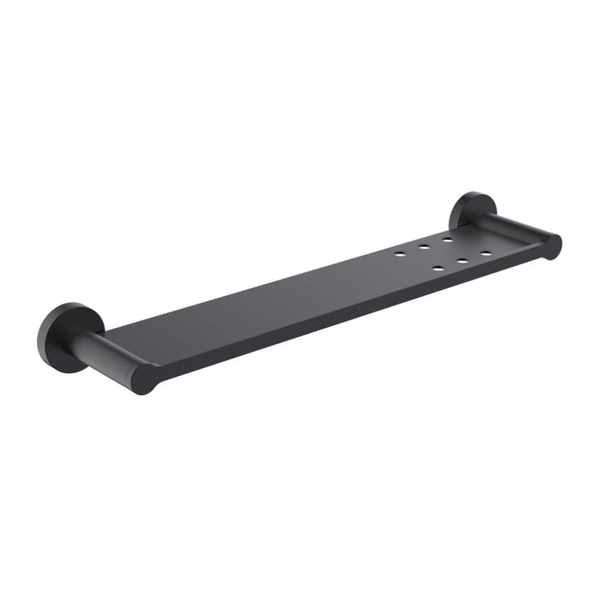Two circular wall-mounts and fixings are connected with a flat, rectangular shelf with an area for placing or stacking items close by to key areas such as bathroom sinks. Six holes are also conveniently located at one end, and can be used to hang things from it or store toothbrushes. This also doubles up as a space to allow water to drip away if it is used inside a showering area.
