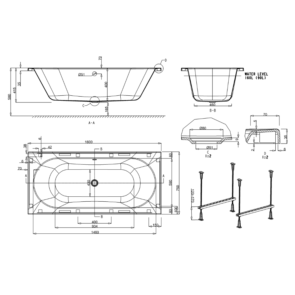 - Dimensions: L: 1600 x W: 750mm x H: 415mm