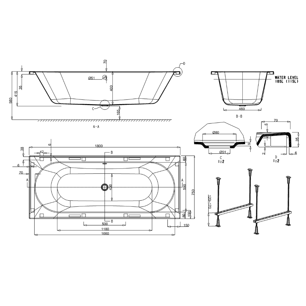 - Dimensions: L: 1800 x W: 750mm x H: 415mm