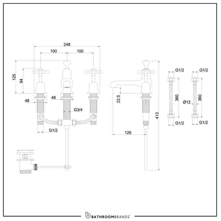 The central spout of this three tap hole basin mixer, which measures 248mm in width and 126mm in its projection, is embellished by an indice which pulls out and pushes back in to close then reopen its integrated pop up waste. Either side of the spout is flanked by its separate pillar tap handles, each topped with an ornate crosshead handle to complement the decorative nature of fixture in line with its nineteenth century inspiration.