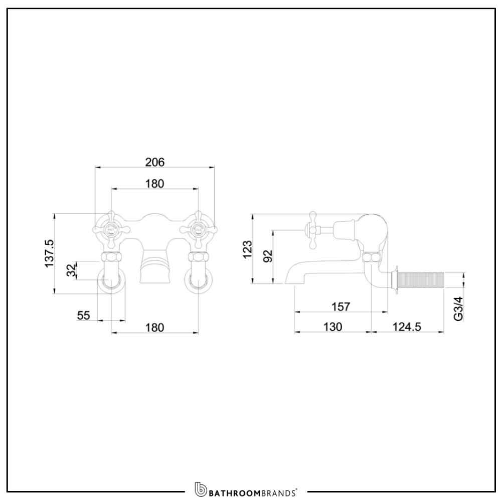 The defining feature of this wall mounted bath mixer tap, which measures 206mm in width and 157mm in projection, is its sculptural spout that widens towards it open end, such that water gushes enticingly from its mouth when in full flow. On either side of the downturned spout are two crosshead handles, each with ceramic indices to indicate whether it controls the hot or cold water level.