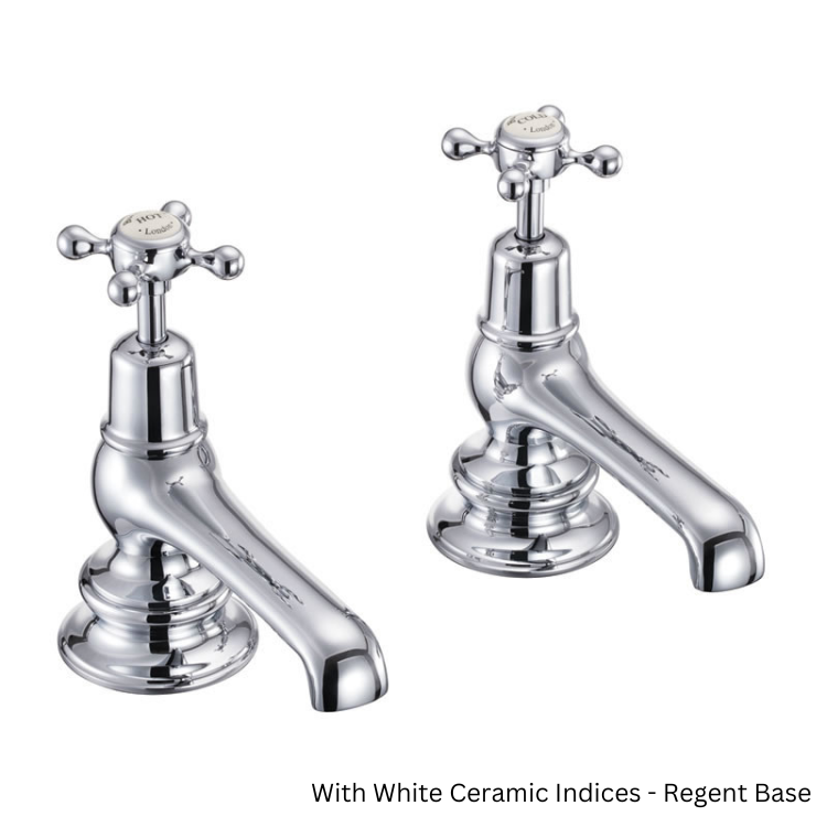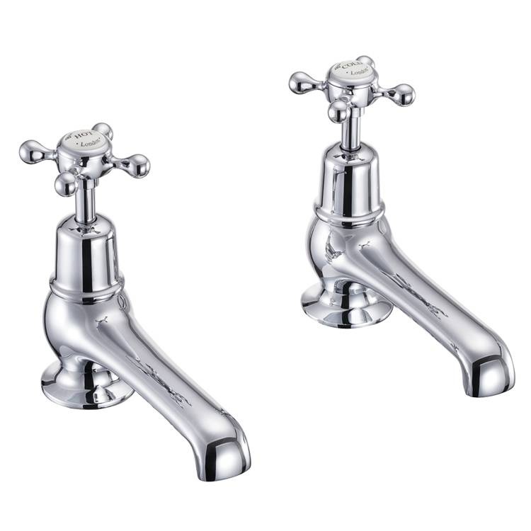 These twin bath pillar taps, which measure 65mm in width and 126mm in their projection, feature elegant spouts, delicately downturned in keeping with their nineteenth century inspiration, as well as crosshead handles with ceramic indices indicating whether they produce hot or cold water.