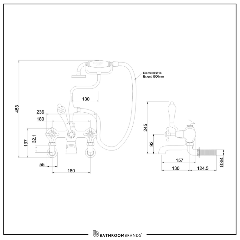 Measuring 236mm in width and projecting 157mm from its mounting, this elegant bath shower mixer tap features a ceramic diverter lever located above its classically shaped spout, which switches the flow of water from the bath to its handset shower attachment. Adorning either side of the tap body are its twin crosshead handles, which are similarly embellished by ceramic indices and are used to control the temperature of the water from either outlet.